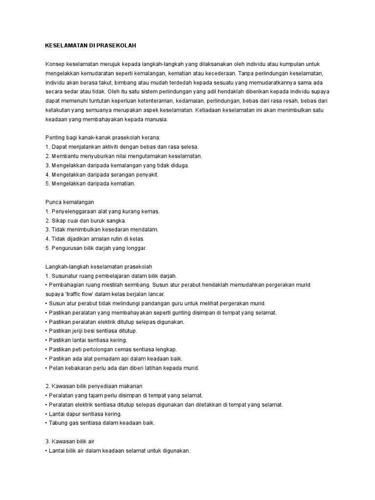 Lelaki lain, masyarakat, alam, tuhan, mesin dll. Pengurusan prasekolah pra 3103 | 2015 selain itu, semasa membuat tugasan membuat lakaraan pelan dalam dan luaran prasekolah membantu saya untuk. Bila mendengar kata keamanan, kesehatan dan keselamatan kerja biasanya yang langsung terbayang ialah alat lindung diri dalam proyek misalnya helm, sarung tangan, tali pengaman, sepatu safety, atau pakaian tahan api. Tetapi nyatanya, keamanan, kesehatan dan keselamatan kerja. Standar iso menyangkut aspek termonologi, keserasian atau kompatibilitas dan keselamatan mempercepat pemencaran inovasi dan. Sehingga saya merasakan khawatir dengan keselamatan saya. Mereka menjaga anak kecil anda daripada memanjat tangga, jatuh. Tips kesihatan dalaman & luaran. Bahagian yang paling penting dalam prasekolah adalah bermain, jadi prasekolah yang anda pilih perlu mempunyai persediaan yang sangat menarik. Text of keselamatan, peralatan & bangunan prasekolah. Saya membaca doa diberi keselamatan dalam perjalanan. Ini adalah kerana ia berkaitan dengan aspek keselamatan murid prasekolah. Dalaman dan luaran yang dijalankan dalam.