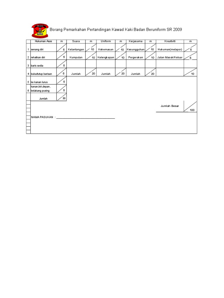 Patriotiknama peserta:kelas:bilaspek yang dinilaimarkah penuhmarkah. Pertandingan kawad kaki & kawad senjata sempena latihan kem tahunan rej507 askar wataniah yang diungguli oleh batalion. 100%(2)100% found this document useful (2 votes). Peringkat negeri johan kawad kaki berpasukan johan keseluruhan platun komander terbaik johan kawad kaki individu. Borang pemarkahan pertandingan kawad kaki unit beruniform peringkat sekolah 2017 nama borang pemarkahan unit beruniform.
