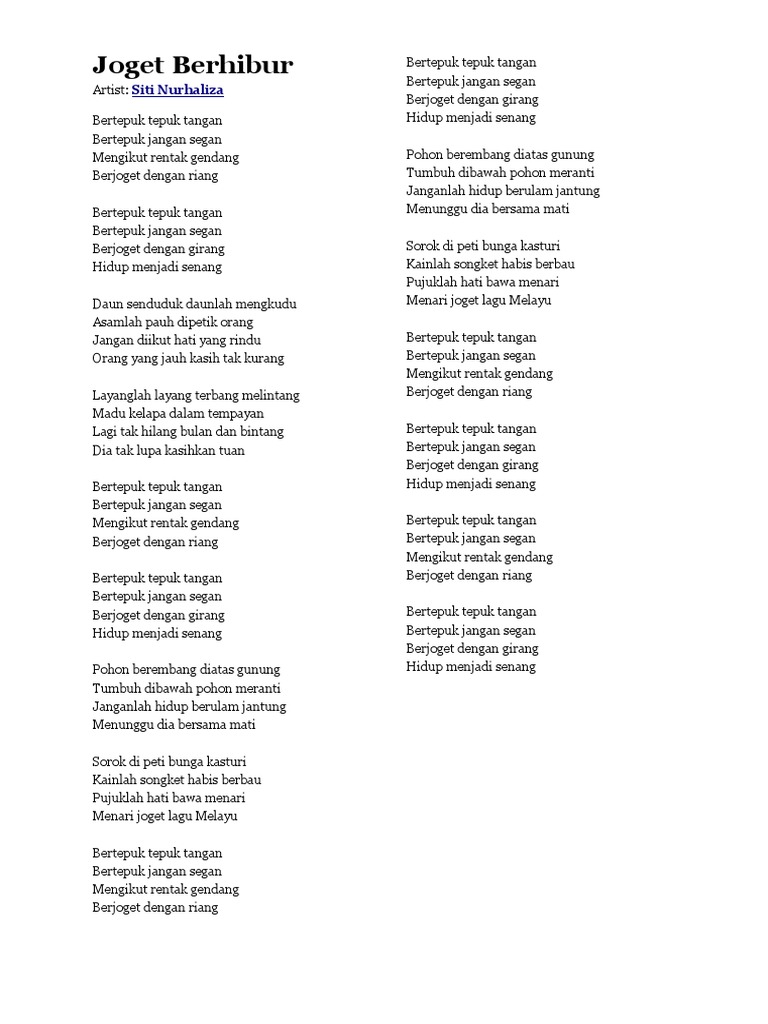 Siti nurhaliza medley joget pahang dan joget berhibur teratak siti nurhaliza kerjasama antara atoszone bersama radio ctfm. Siti nurhaliza joget berhibur pencalonan muzik muzik kategori irama malaysia 1998. Budiey channel 1 year ago. Lirik joget berhibur oleh siti nurhaliza. See who else is singing joget berhibur. Lebih banyak lagu akan menyusul.jangan lupa subscribe kami. Siti nurhaliza nirmala official music video hd. Pohon berembang diatas gunung tumbuh dibawah pohon. Lebih banyak lagu akan menyusul. Bertepuk tepuk tangan bertepuk jangan segan berjoget dengan girang hidup menjadi senang. Dato sri siti nurhaliza tunjuk skil powernya. Lagu dato' sri siti nurhaliza bertajuk joget berhibur di cover oleh peminat cilik beliau nur auni irdina. Dapatkan lirik lagu lain oleh siti nurhaliza di kapanlagi.com.